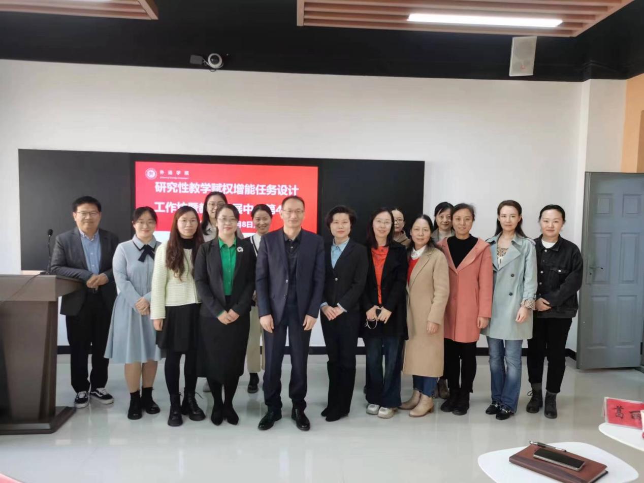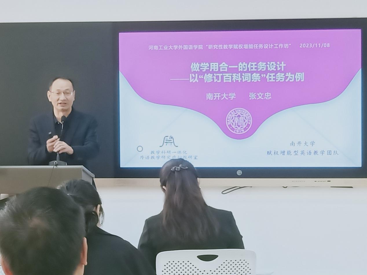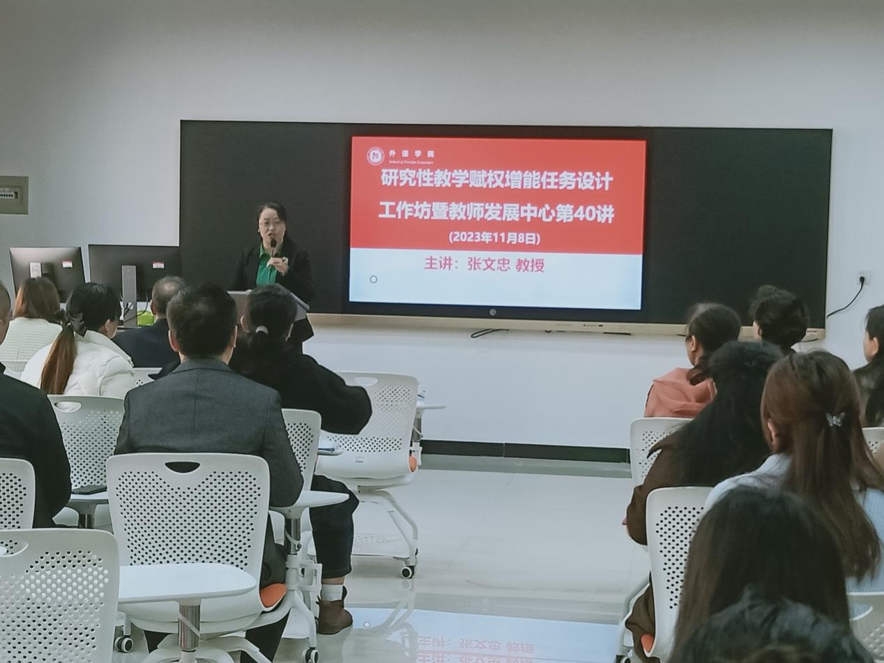 在5329虚拟情景教学实训室召开“研究性教学赋权增能任务设计工作坊暨教师发展中心第40讲”。教育部高等学校外国语言文学类专业教学指导委员会英语专业教学指导分委员会委员、南开大学外国语学院教授张文忠应邀莅临学院教师发展中心指导。学院班子、各系室主任和骨干教师以及学生代表参加本次工作坊,工作坊由色情短视频