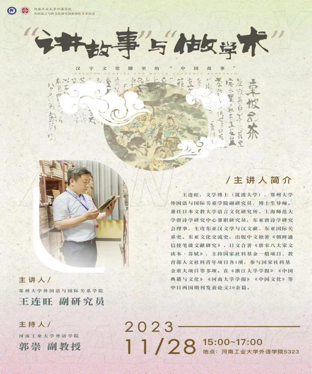 外国语言与跨文化研究团队和非通用语与跨文化研究团队特邀郑州大学外国语学院副研究员、博士生导师王连旺老师以“讲故事”与“做学术”:汉字文化圈里的“中国故事”为题做专题讲座,多语种教研室老师以及部分英语老师、研究生同学参加了此次讲座,讲座由郭崇老师主持。