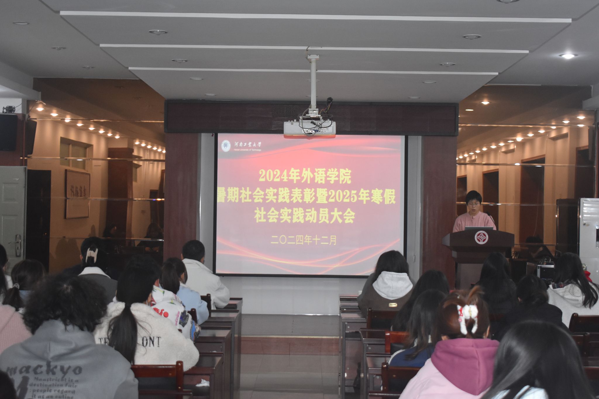 于2024年12月5日在5225会议室召开2024年暑期社会实践表彰暨2025年寒假社会实践动员大会。学院党委书记王云涛、党委副书记王晓东和学工办主任郭珊珊出席本次会议,2024年社会实践优秀团队代表及2023级各班班长、团支书参加了本次活动,大会由辅导员吕明环主持。