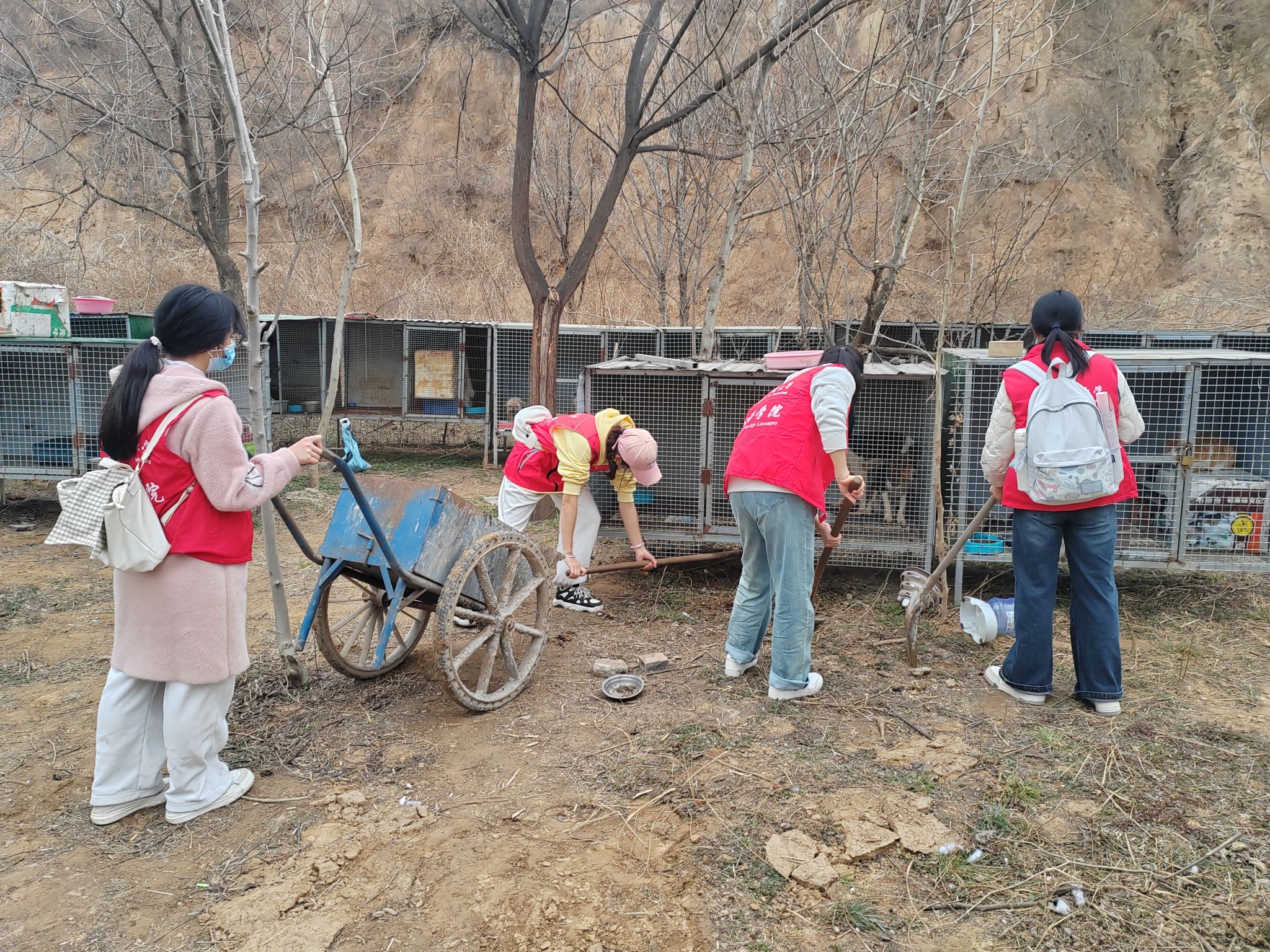 活动现场,志愿者们身着红色马甲,分工协作投入服务:有的清理杂草和树枝,有的打扫铁笼内外的卫生,还有的协助工作人员对小动物进行日常护理;部分英语专业学生发挥特长,为基地设计双语领养宣传手册。此外,同学们还亲手制作了“爱心认养牌”,标注每只动物的名字与性格特点,让它们感受到更多“被看见”的温暖。经过大家的共同努力,小动物保护中心的环境得到了显著改善,小动物们的生活质量也得到了提升。