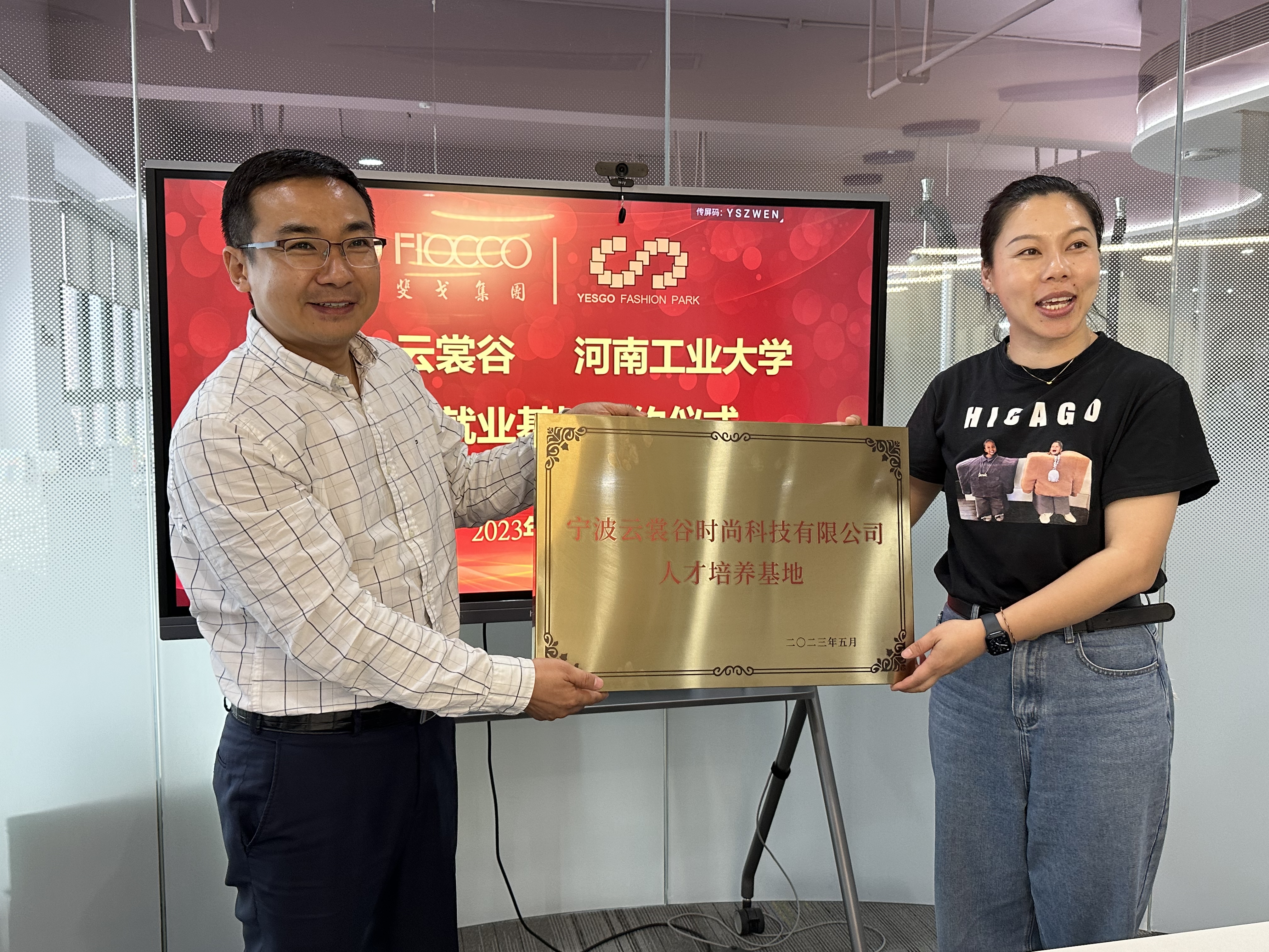5月19日下午,在宁波云裳谷时尚科技有限公司园区,斐戈集团股份有限公司高管、校友夏爱平副总和公司人力资源主管陪同下,参观了云裳谷平台园区和公司的工厂及销售展示中心。在交流会上,夏爱平介绍了园区平台在产业人才、技术、资金、品牌、渠道、供应链等方面的情况,以及赋能园区中小企业产业创新和转型升级的功能与成效。双方围绕拓展合作领域、产教融合育人、共促学生就业等方面进行了沟通,希望以本次交流为契机,校企双方建立人才培养、就业联动的常态化合作机制,通过深化校企合作和供需对接,真正地实现校企双赢。会后,双方进行了人才培养基地和就业创业基地签约与授牌仪式。