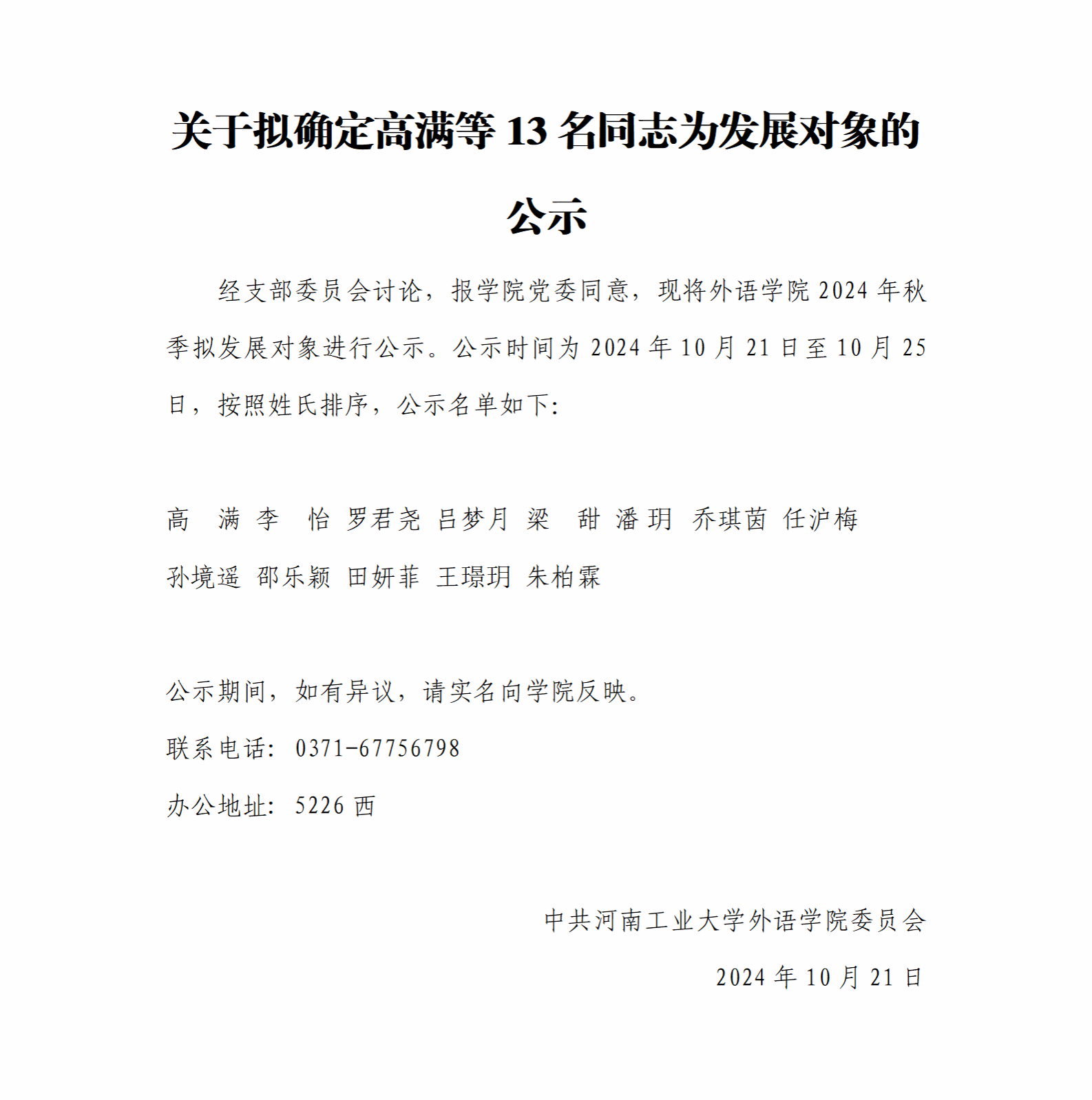 关于拟确定高满等13名同志为发展对象的公示