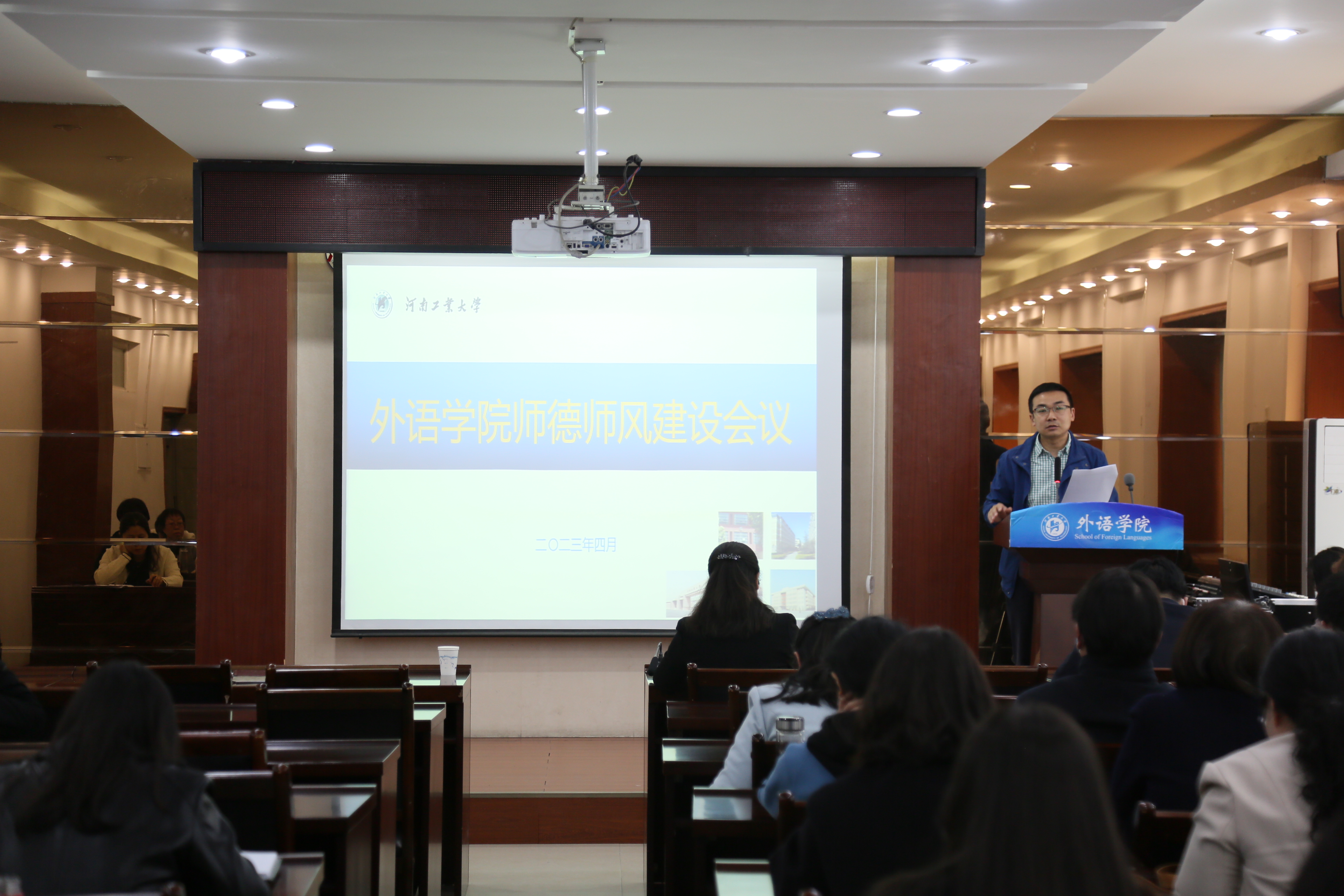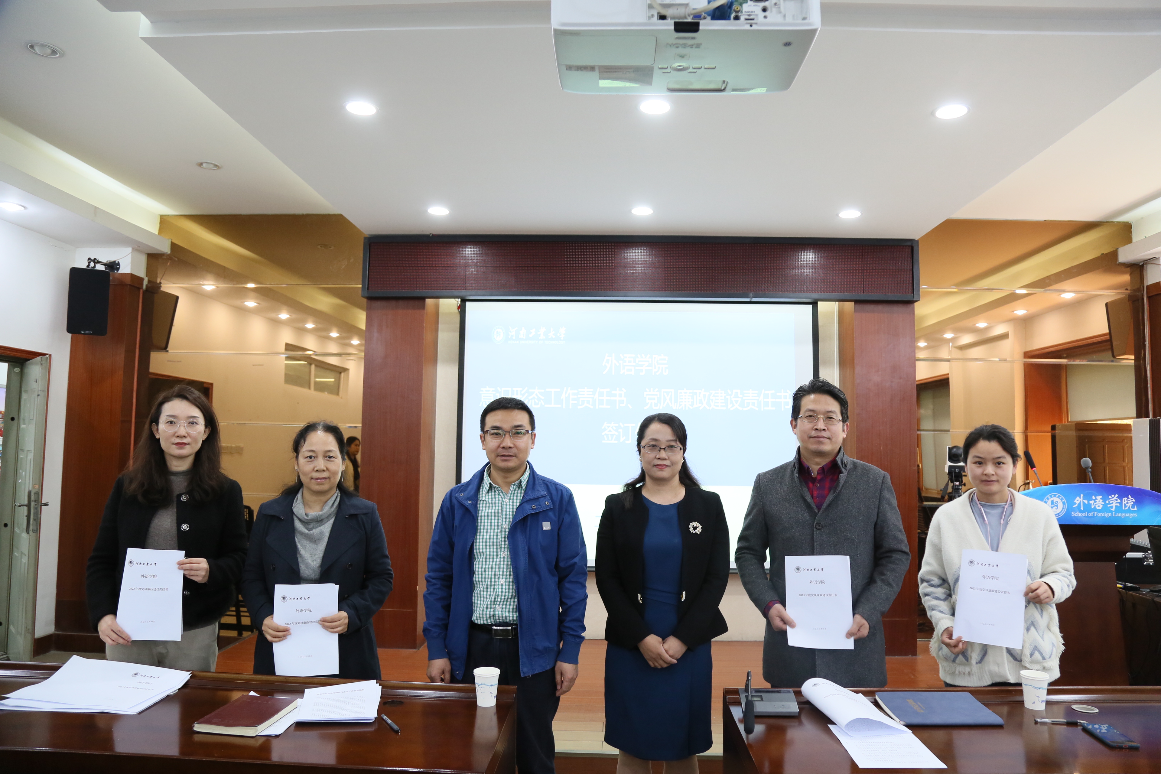 在全体教职工大会上,举行了党风廉政建设和意识形态工作责任书签订仪式。王云涛和黄辉辉代表学院领导班子与各系(部)主任、科室主任、党支部书记分别签订了《党风廉政建设责任书》和《意识形态工作责任书》,进一步压紧全面从严治党和意识形态工作要求,落实好“党政同责、一岗双责”。签订责任书以后,大家表示将认真落实好主体责任,扎实抓好工作职责范围内的党风廉政建设和意识形态工作责任,结合习近平新时代中国特色社会主义思想主题教育和学院教学科研中心工作,补短板、强弱项,推动全面从严治党在本部门落实落地落细。