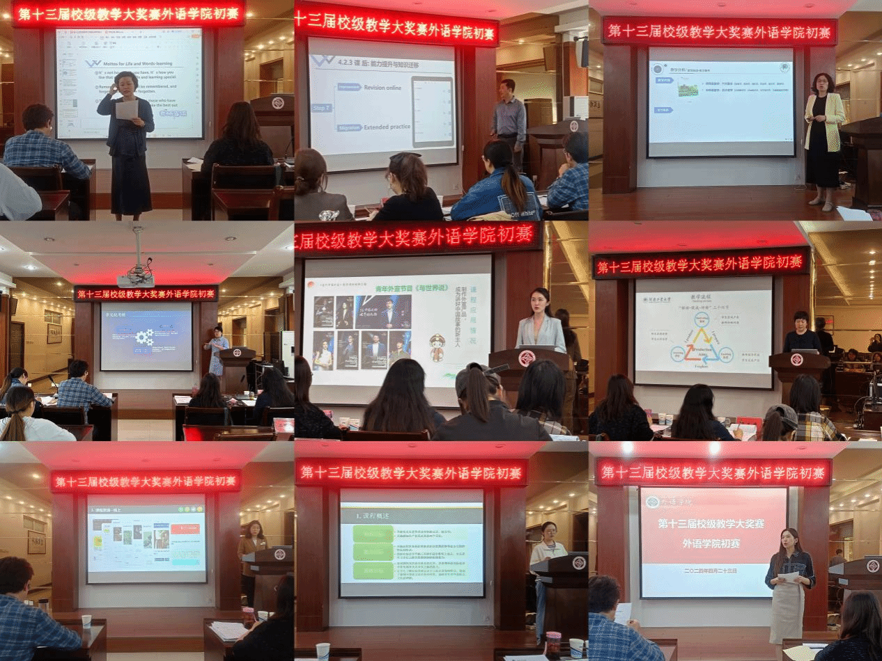 本次教学大奖赛不仅关注教学成果,更关注教学过程中的创新与实践。经各系部初赛,共有7位教师入围院级复赛。比赛中,参赛教师展示了精心准备的说课及课程教学创新设计,展现了P—MASE教学法、产出导向法等教学理论与课程内容环环相扣的巧思妙想;演示了语料库建设、翻译技术、人工智能等现代化信息技术在语言及翻译教学中的应用;体现了“领域新、内容新、手段新”的教学研究成果;融入了用外语讲好中国故事、注重人文素养、立足国际视野、鼓励青年学生践行大国外交等思政元素;产出了文创周边、青年演说、志愿者活动、学术期刊发表等丰富的教学成果。