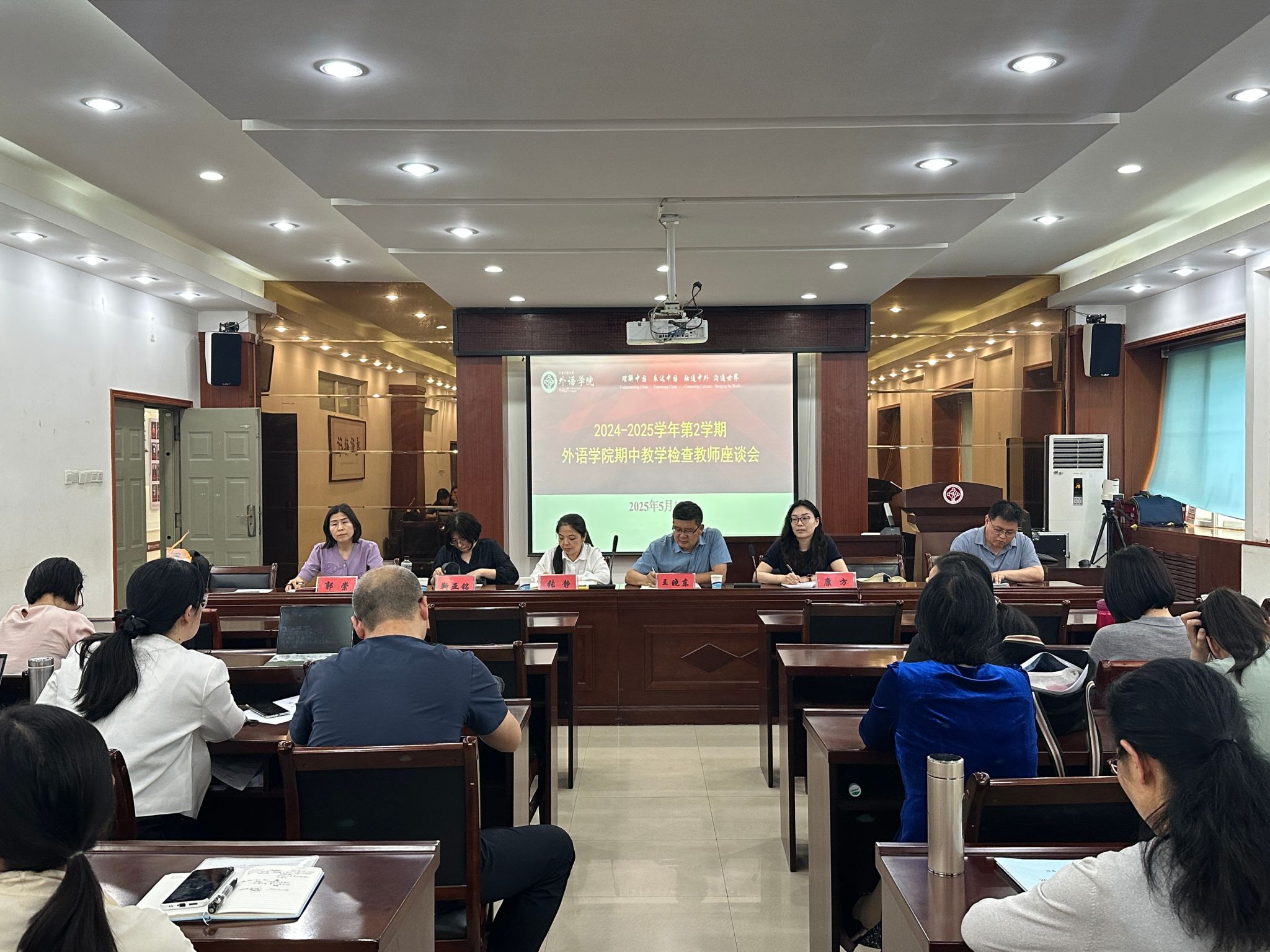 会议分教师评学和学生评教两个环节。教师评学环节以“数智时代创新人才培养”为主题,英语系、翻译系教师充分肯定学生在学习纪律、任务完成度等方面的积极表现,同时提出需强化数智素养、课堂互动深度及自主学习能力等。与会教师围绕学科专业AI赋能、数智类课程体系建设,智慧课程资源建设、教学设施保障等重要议题展开探讨并提出了宝贵的意见和建议。