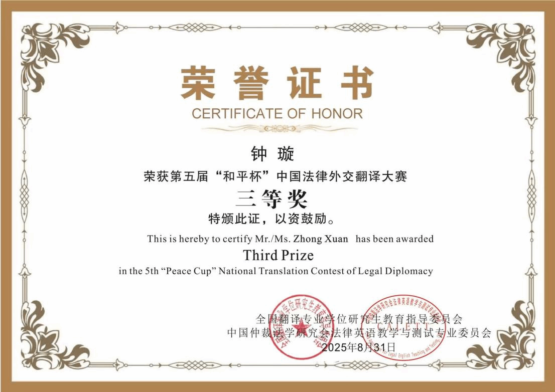 教师杜巧阁指导下,凭借扎实的英语功底与深厚的法律翻译素养,在大赛中荣获三等奖,展现我校学子在法律翻译领域的强劲实力。