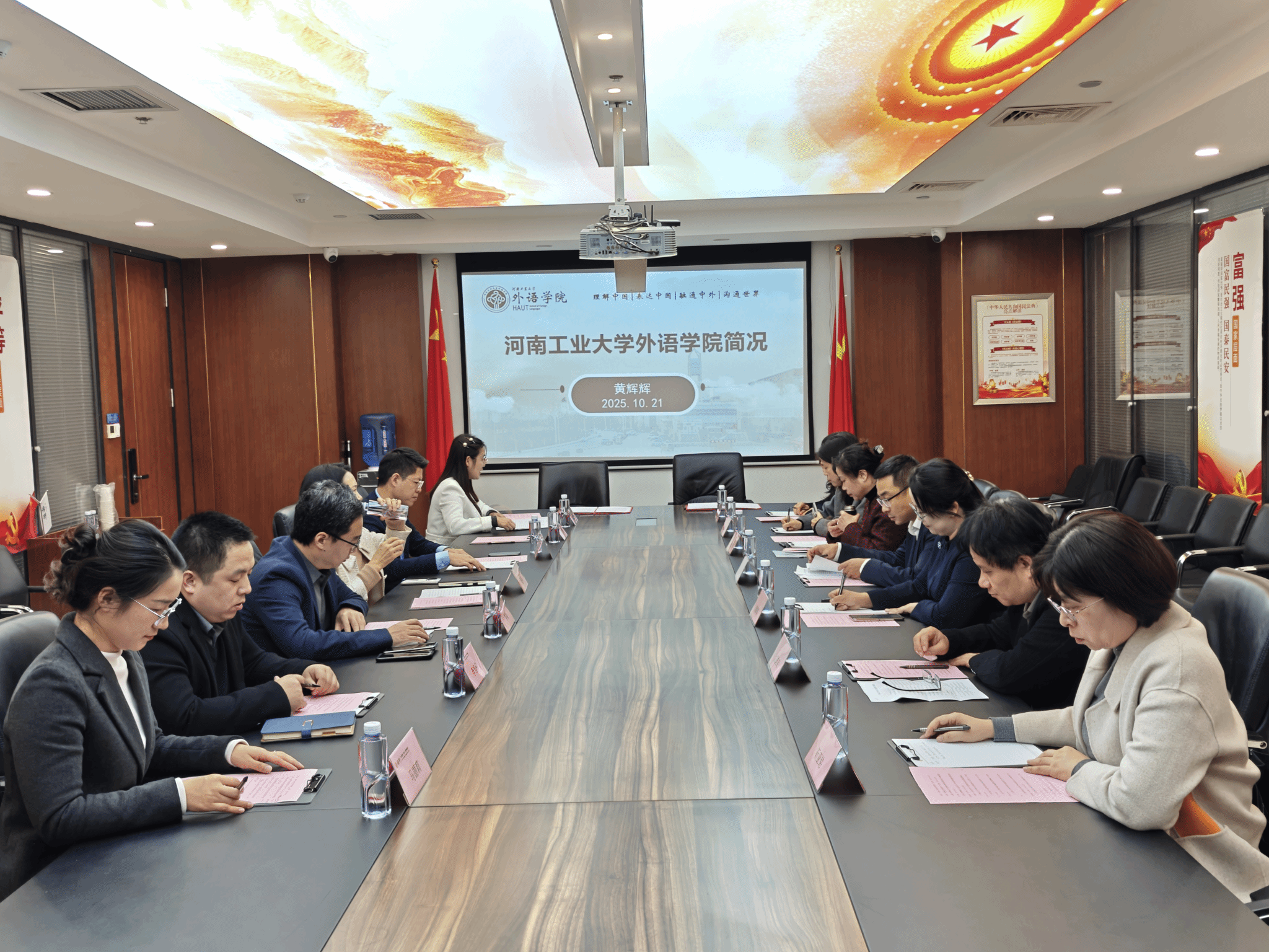 葛丽萍副院长介绍学院本科复合型人才培养及国际交流合作情况,凸显学院在培养复合型外语人才方面的举措;沈国荣副院长介绍学院科研及社会服务情况,为校所在科研服务领域的合作拓展空间。