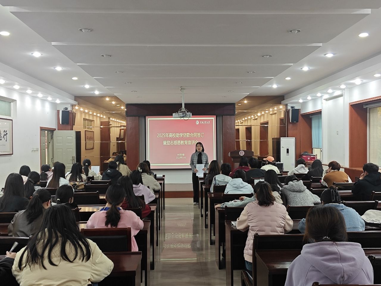 在博闻楼5225会议室召开了2025年高校助学贷款合同签订暨诚信励志教育大会,学院学生资助工作负责人郭珊珊、资助助理及申请高校贷款的学生参加了本次会议。