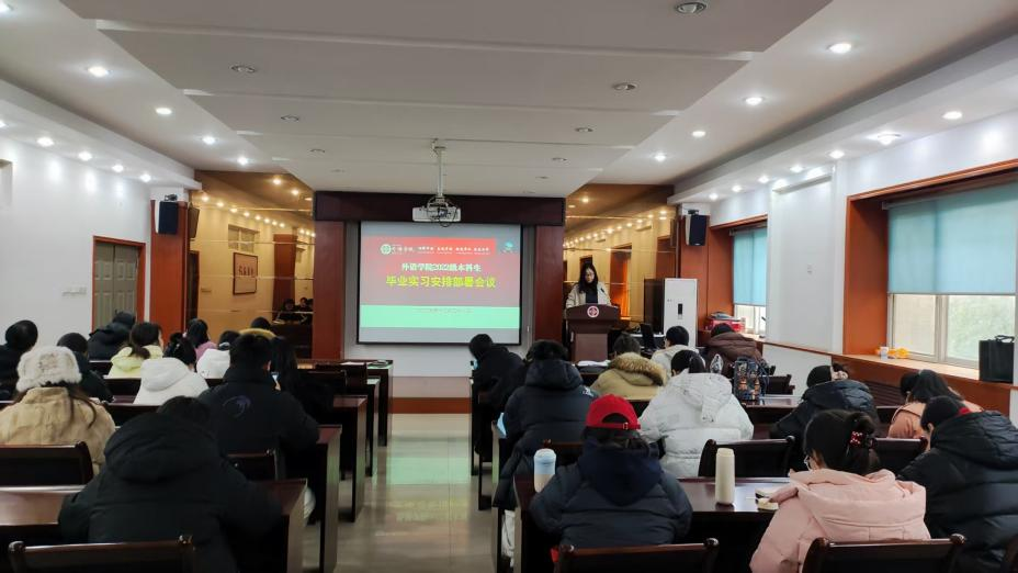 在5225会议室组织召开2026届毕业生实习动员大会。翻译系主任靳亚铭、英语系主任康方、教学办方喜军主任及全体2026届毕业生参加会议。会议采用线上线下相结合的方式进行。