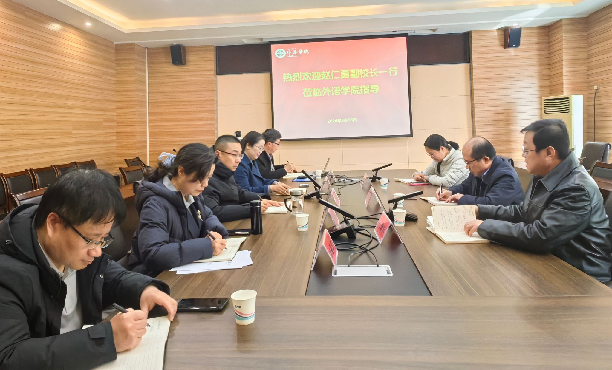 就国际交流工作开展调研指导。国际交流与合作处处长刘国仕、副处长王优优一同调研。外语学院领导班子全体成员参加会议。