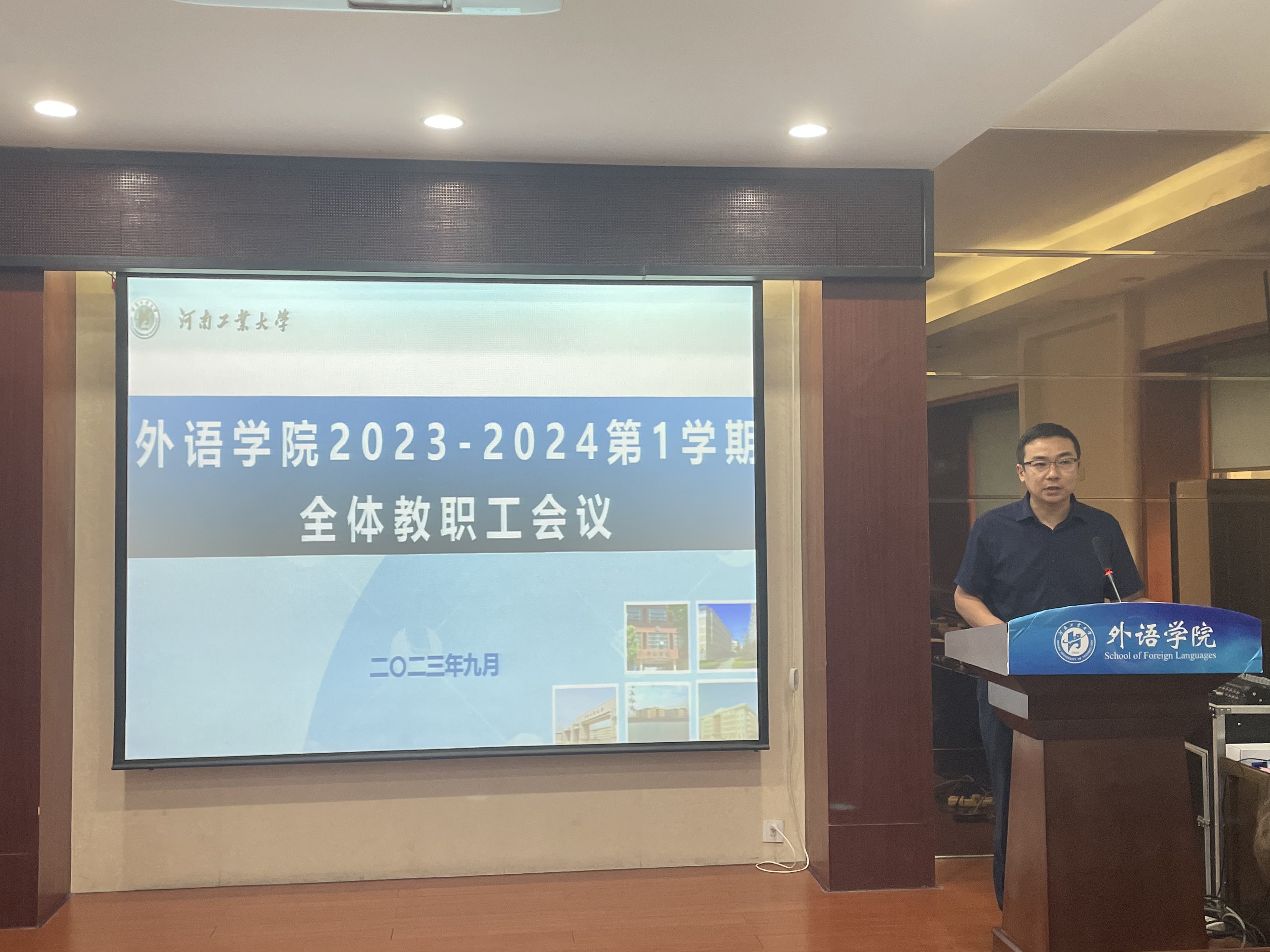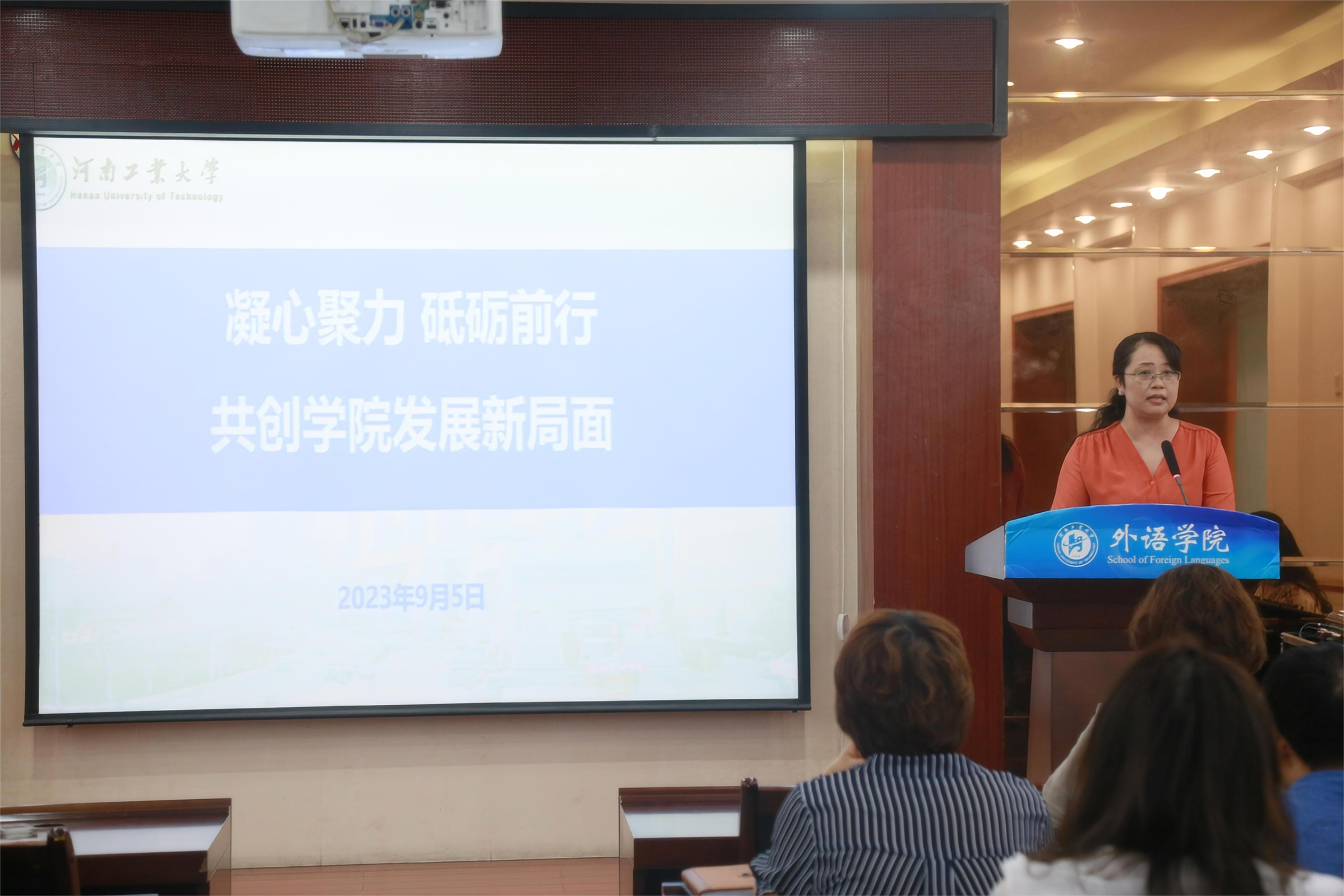 会上,黄辉辉全面总结了学院上半年取得的各项成绩,并对暑期期间学院诊断性审核评估工作与新一轮河南省重点学科申报工作进行了回顾与总结,对学院教师的辛勤付出与努力拼搏表示感谢,并以《凝心聚力 砥砺前行 共创学院发展新局面》为题为全院师生做主题报告。报告结合国家新时期教育教学改革的主要精神,从外国语言文学学科建设、一流本科专业与一流课程建设、翻译硕士专业学位点建设和学院年度目标考核工作等四个方面全面分析了学院学科及专业在国内省内的排名情况及特色优势,深刻剖析了学院当前发展中所面临的困难与挑战,并对标对表提出了学院新时期各项工作的建设规划、建设目标与建设方向。黄辉辉指出,目前学院正进入内涵建设与质量提升的关键时期,学院全体教师应积极、深度参与学院发展与建设,凝心聚力、分工协作,聚焦问题、紧盯目标,强化学习、持续提升,强化内涵、开拓创新,持续建设学习型学院,推进学院从教学型学院向教学科研型学院的转型,促进人才培养质量提升,共创学院发展新局面。