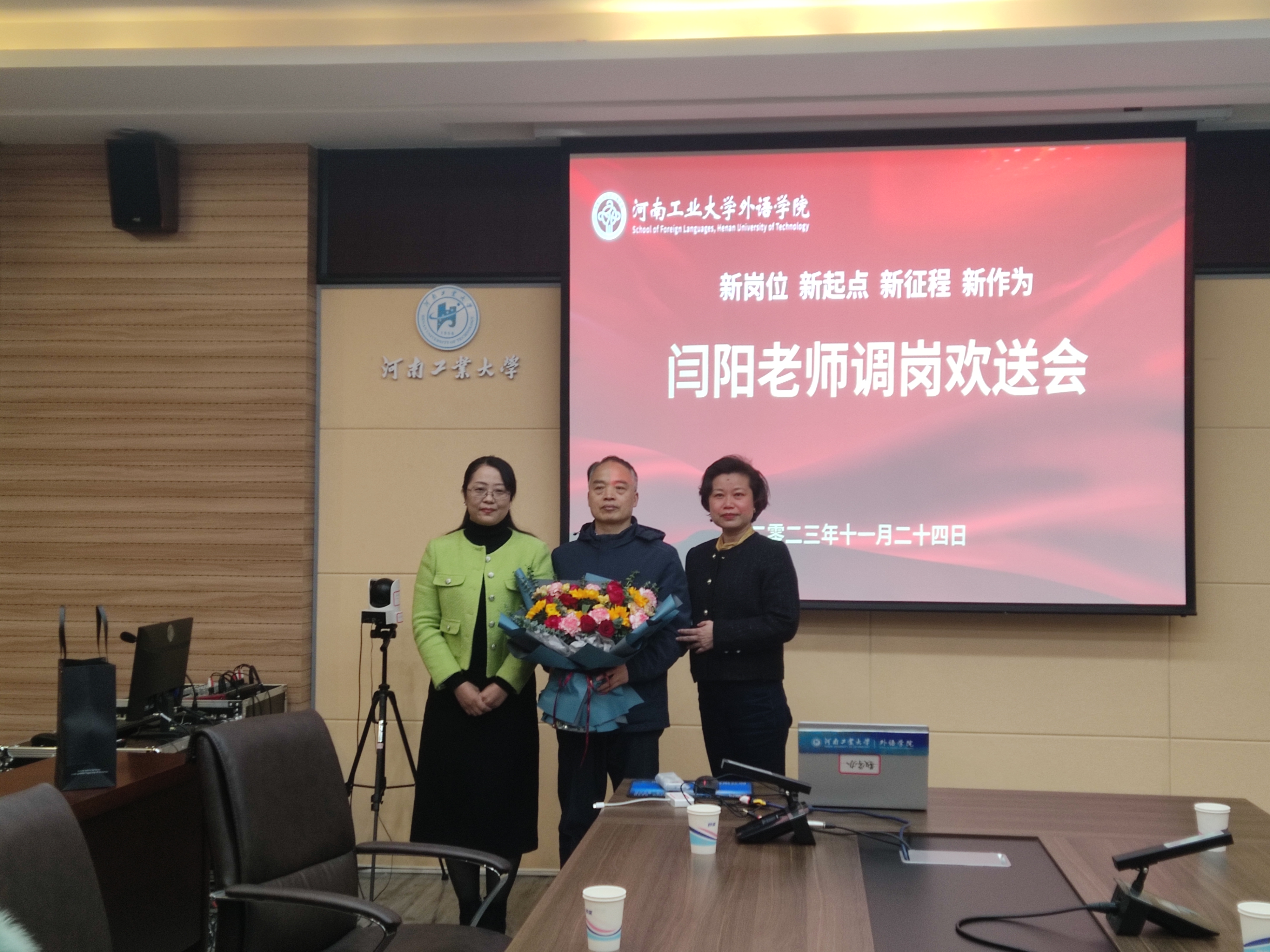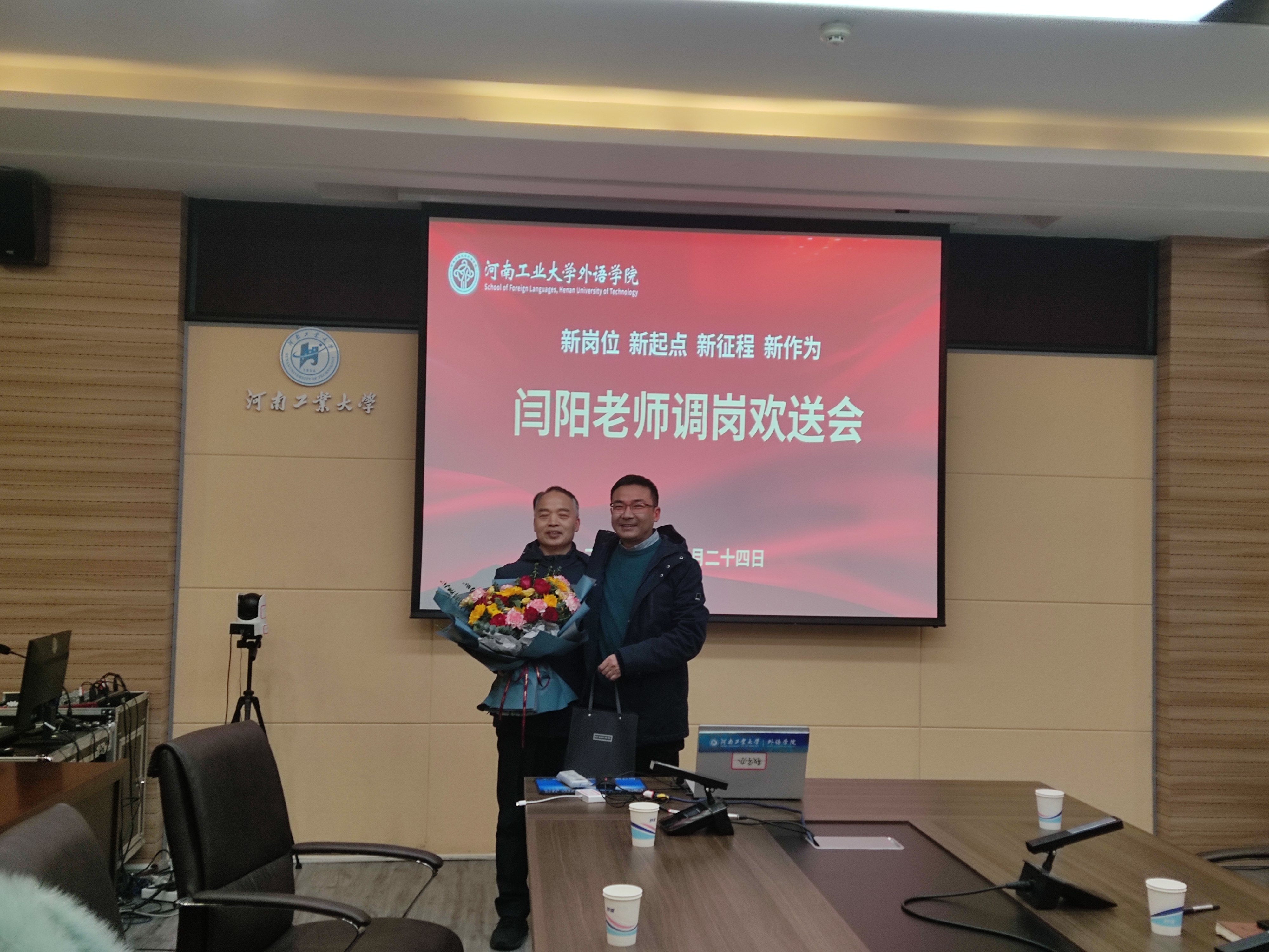 最后,学院党委书记王云涛和院长黄辉辉分别为闫阳老师送上纪念品和鲜花,全体与会老师合影留念。(撰稿:刘振 摄影:刘振 审校:李建锋 审核:王云涛)