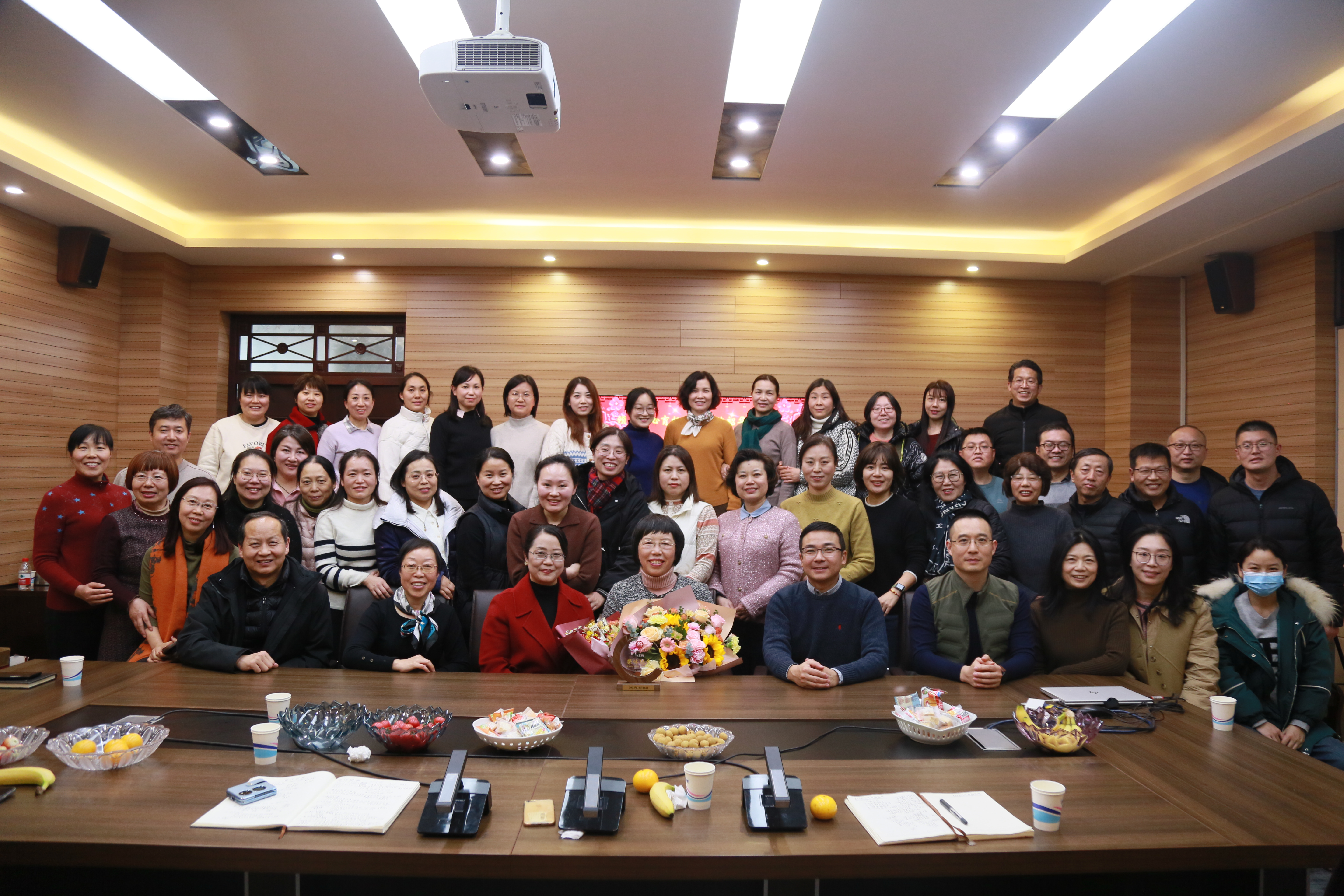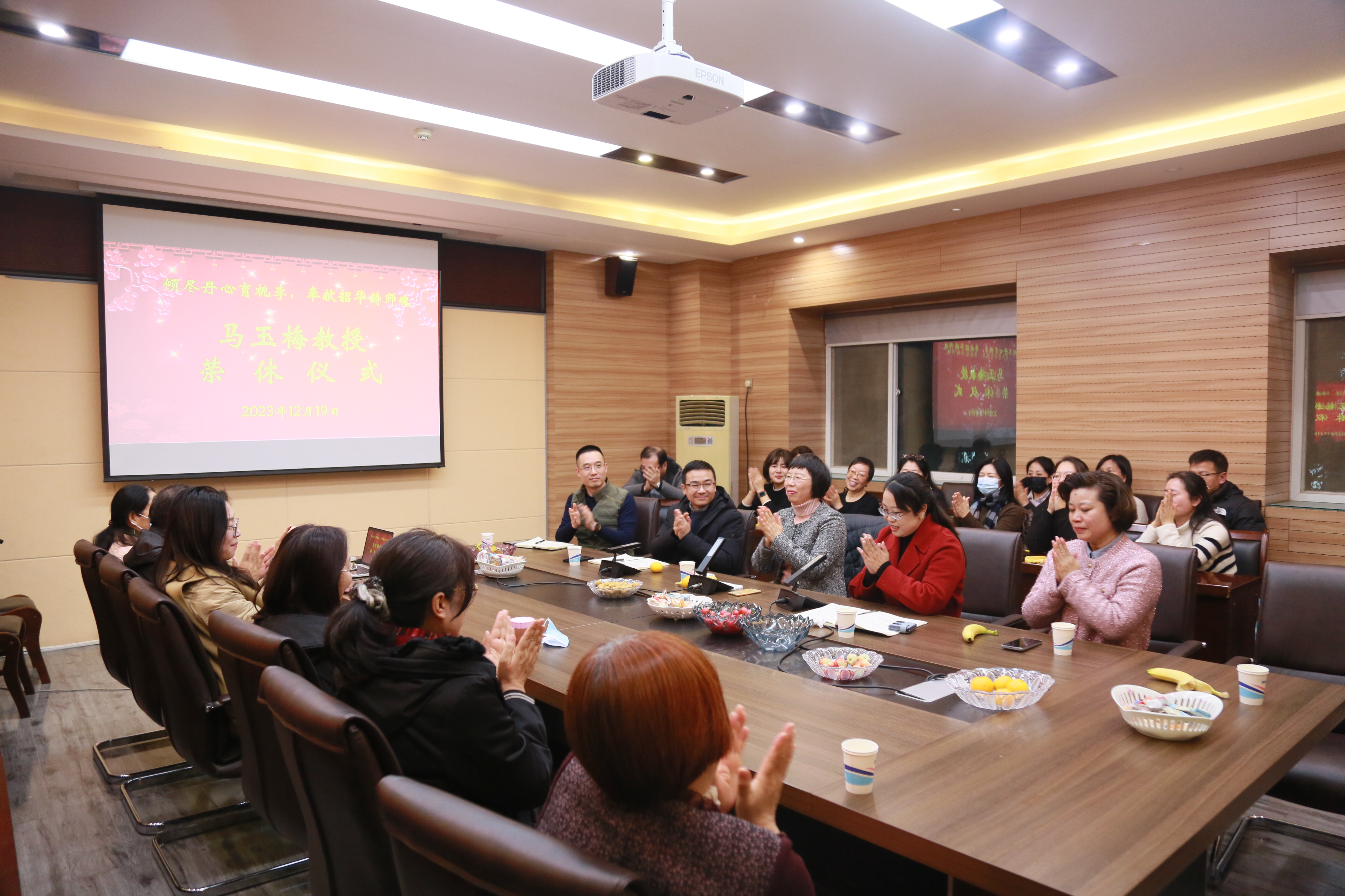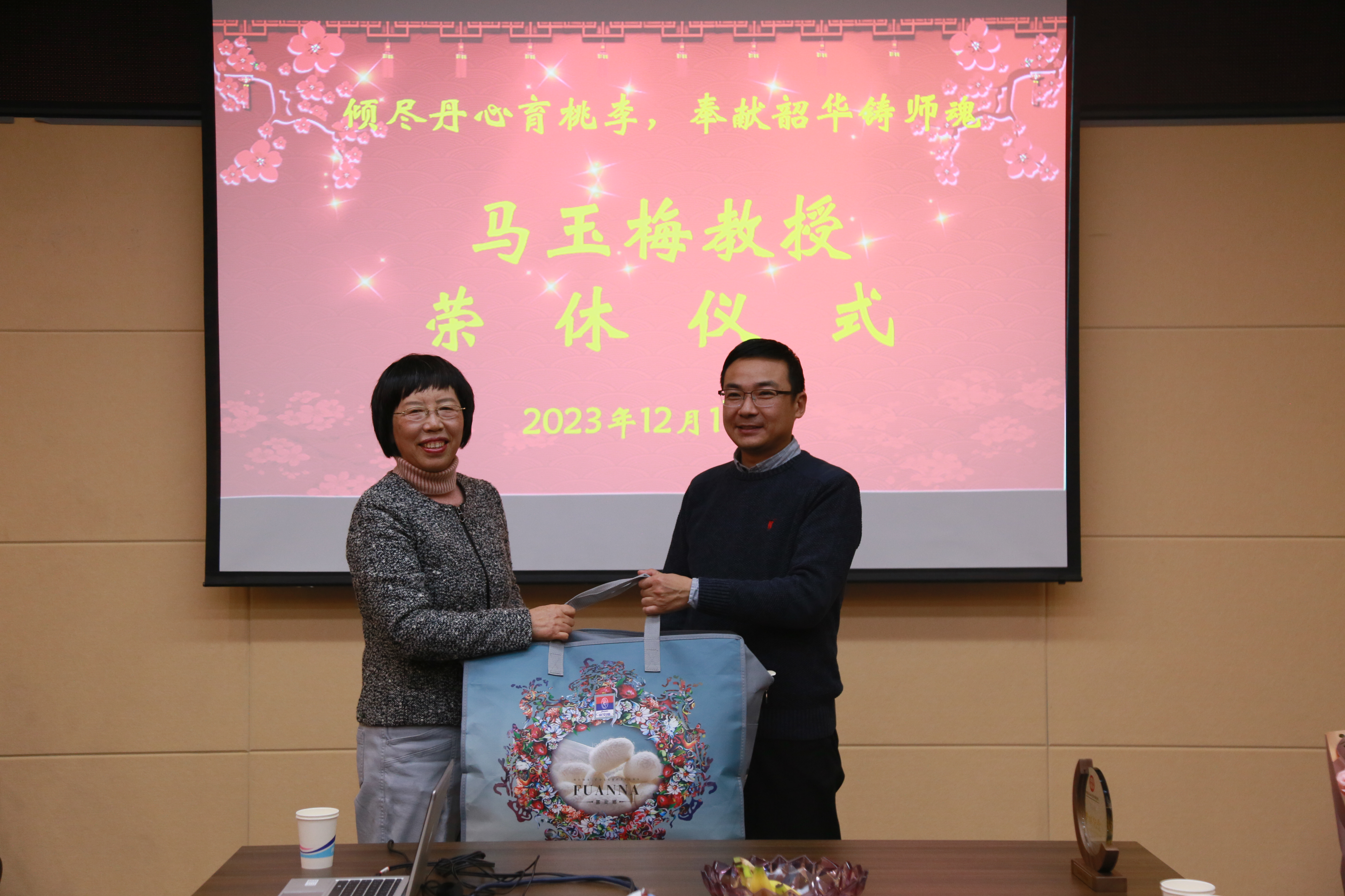 在5231会议室为马玉梅教授举行荣休仪式,学院领导班子、系部主任、支部书记、行政办公室全体老师及50余名教师代表参加仪式。仪式由院党委书记王云涛主持。