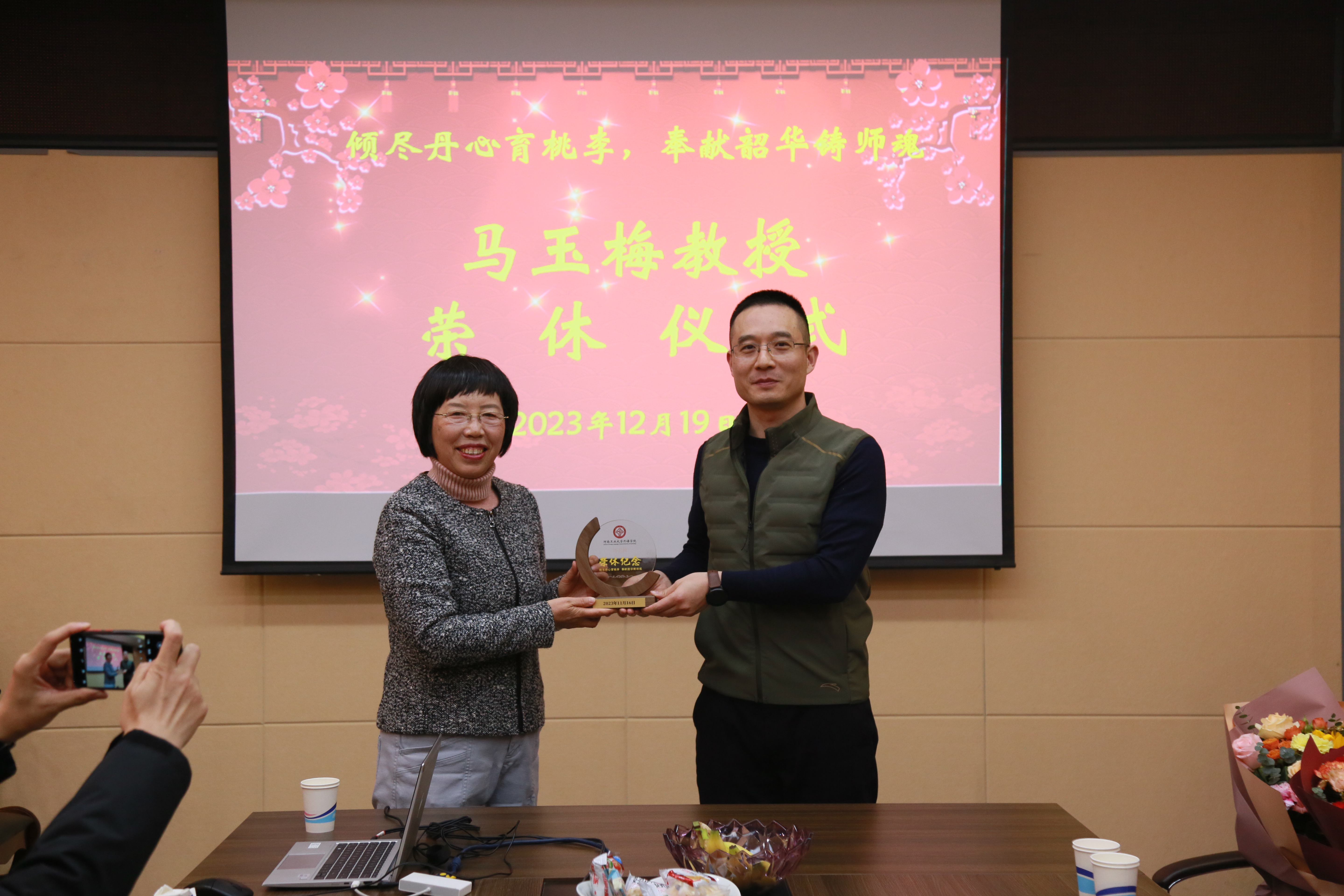院副书记、副院长李建锋为马玉梅教授颁发“荣休纪念”杯