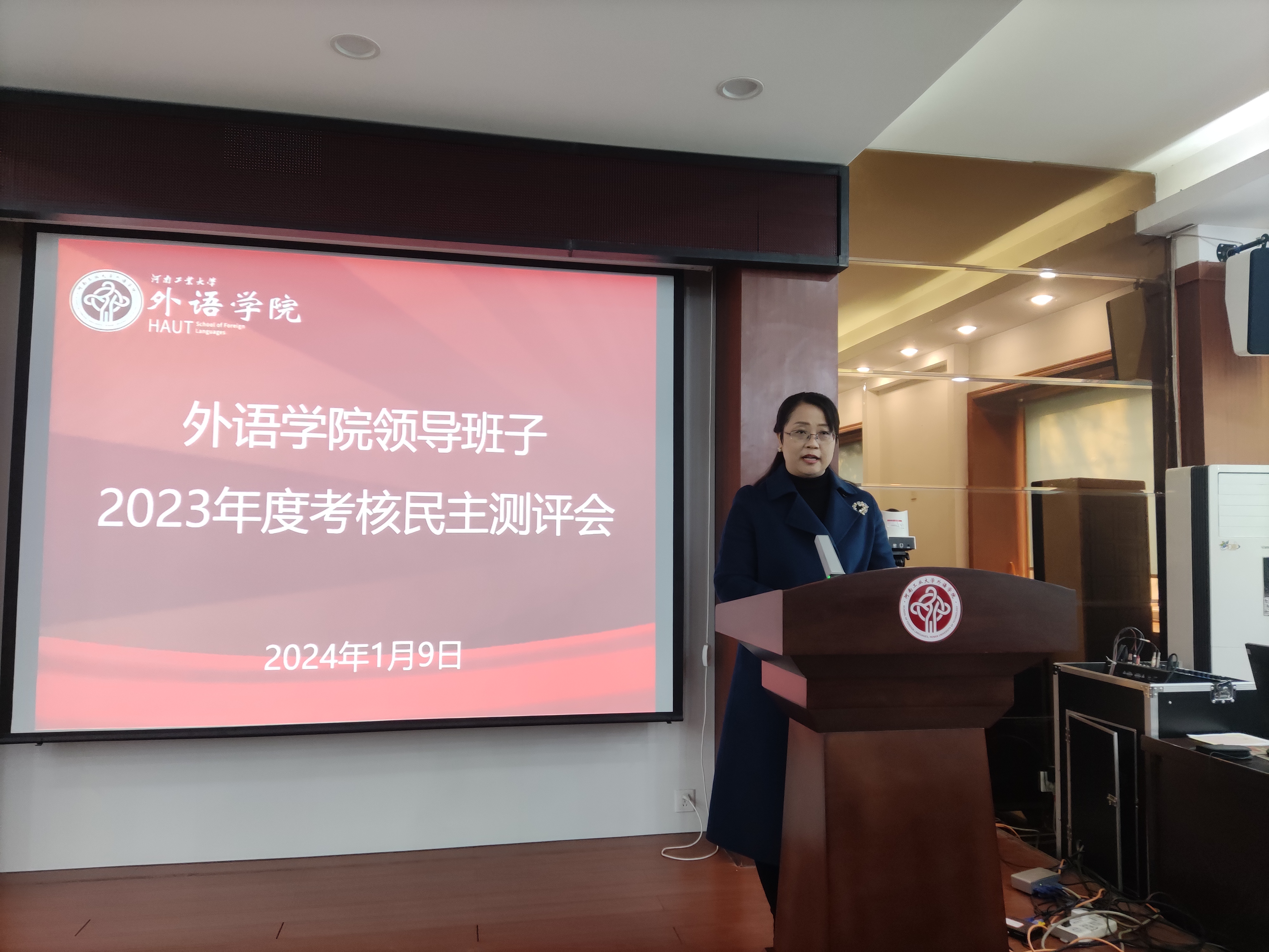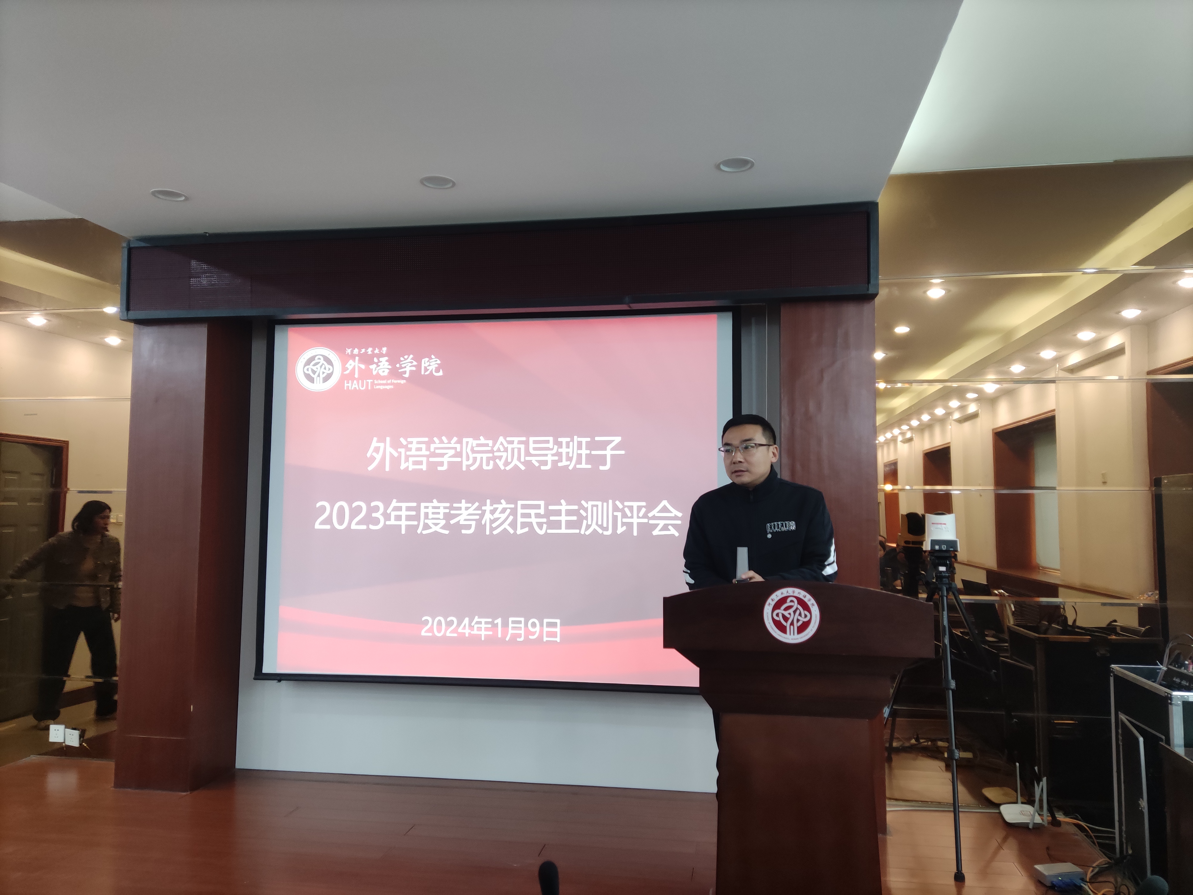 院长黄辉辉代表学院领导班子作述职报告。她从党建、教学工作、学科建设、学位点与研究生、学生工作、科研与社会服务等方面,全面回顾总结了学院2023年工作情况。她讲到2023年学院获批国家社会科学基金项目2项,发表A类和B类权威期刊论文2篇。新增到账科研经费为60.3万元,取得了历史性突破;学院外国语言文学一级学科,通过河南省第九批重点学科验收,并获批新一轮河南省重点学科立项;成功举办第三届全国“翻译技术教学科研创新”暨中华典籍外译及国际传播专题论坛,获人民日报、学习强国、河南日报等诸多媒体的报道,极大促进了学校、学院社会声誉和学术影响力的提升。她表示这些成绩的取得与学院全体教职工辛勤工作密不可分,她代表学院领导班子向全体教职工表示感谢,希望大家再接再厉,在2024年共同开创色情短视频