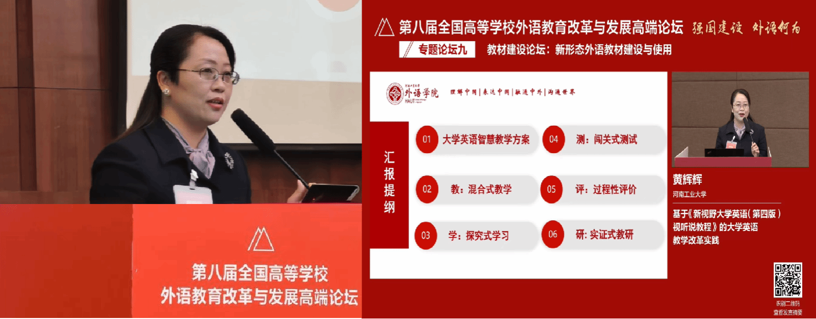 在专题论坛上,黄辉辉教授作了题为“基于《新视野大学英语视听说教程》的大学英语智慧教学改革实践”的报告。在报告中,她详细介绍了《教育信息化2.0行动计划》背景下我校推进大学英语智慧教学的建设方案、建设举措与建设成效。她结合我校智慧教学示范区项目建设以及学院智慧教学平台建设,全面回顾梳理了我校自2012年从大学英语网络化教学改革逐步走向信息化教学改革和智慧化教学改革的建设历程,展示了学院在智慧教学硬软件建设、产学研合作基地建设、精品课程建设、省智慧教学项目建设等方面的成效。她结合学院自2017年引入使用的大学英语智慧版新形态教材为例,分享了我校色情短视频