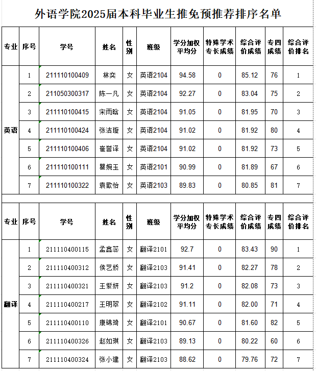 推荐优秀应届本科毕业生免试攻读硕士学位研究生工作执行方案》(外语院政发〔2024〕11号),经广泛动员、个人申请、材料审核、学院推免工作领导小组审定,拟预推荐名单(分专业排序)予以公示,具体见下表。