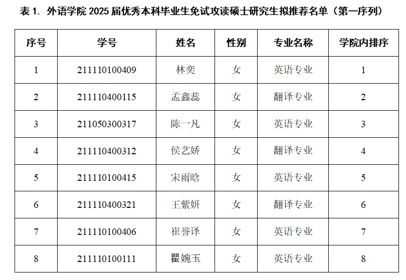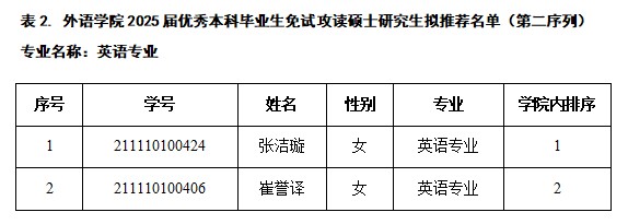 推荐优秀应届本科毕业生免试攻读硕士学位研究生工作执行方案》(外语院政发〔2024〕11号)文件精神,经广泛动员、个人申请、材料审核、学院推免遴选工作小组审定,在预推荐名单公示后,根据学校最终下达分配给学院的指标方案和指标数量,经学院推免遴选工作小组审定,按照分配名额的1.5倍进行公示,拟推荐名单(分两个序列),如表1和表2所示。