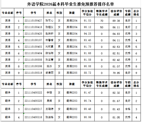 推荐优秀应届本科毕业生免试攻读硕士学位研究生工作执行方案》(外语院政发〔2025〕7号),经广泛动员、个人申请、材料审核、学院推免工作领导小组审定,拟预推荐名单(分专业排序)予以公示,具体见下表。