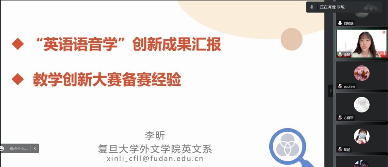 师生系统介绍了复旦大学本科生《英语语音学》课程设计,并简要分享了参加教学创新大赛的经验。团队成员、博士教师、教学大赛培育选手以及研究生代表等师生参会,会议由副院长葛丽萍主持。